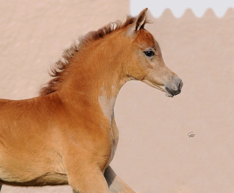 We are very happy to present some photos of Al Ayal's (Al Ayad x The Vision HG), first-born foal, who is bred and owned by Ajman Stud. This beautiful filly is out of the mare Bint Delavida (Ansata Sinan x Om El Deladiva), and we are very pleased with the great promise she shows. Al Ayal is currently abroad, being campaigned at halter and covering some excellent mares. This very striking young stallion will be an important herd sire for us upon his return home, not only because of his extreme quality and type, but because of the rare Old German bloodlines he carries through his sire. These include many rare yet influential foundation horses such as Mahomed, Machmut, and the legendary mare Mahameh, as well as the direct Ansata Halim Shah son Maysoun. Our congratulations to Ajman Stud on this beautiful filly!